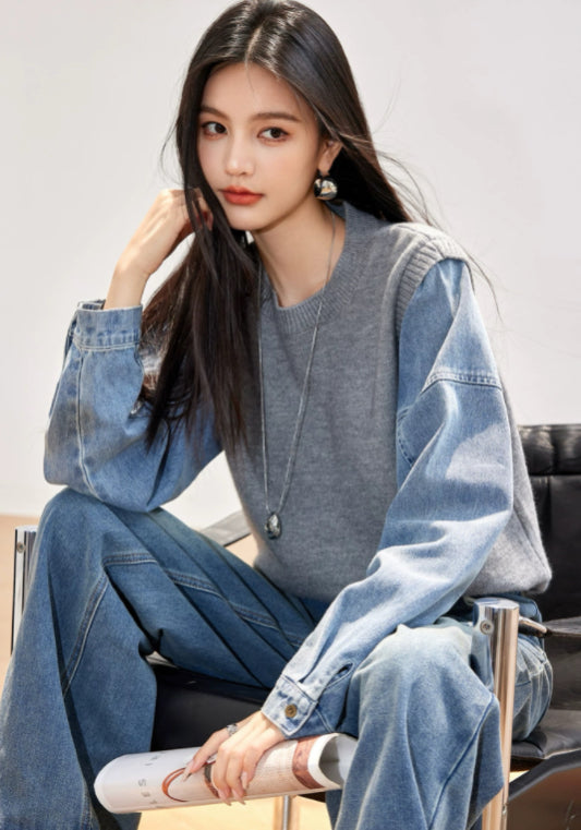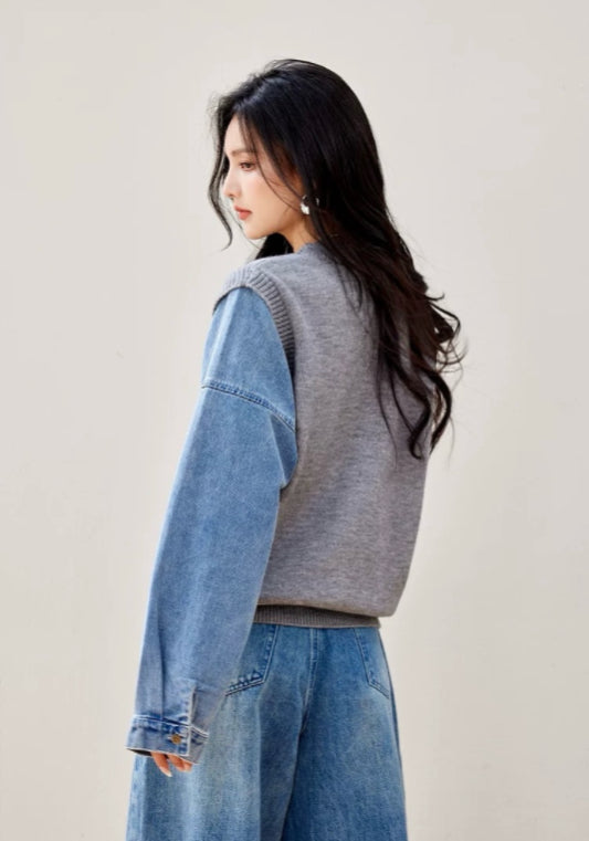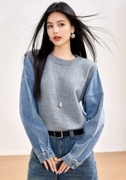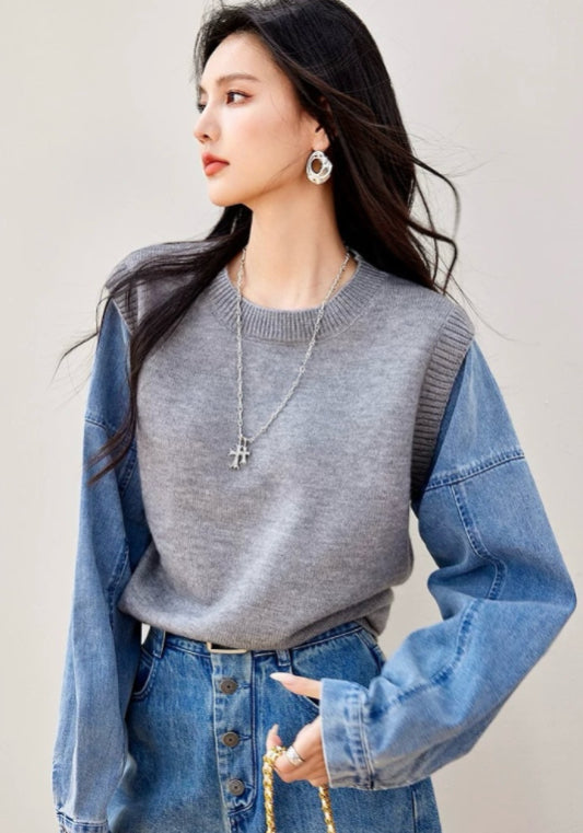 柔軟針織與丹寧拼袖結合,增添層次感與舒適感。