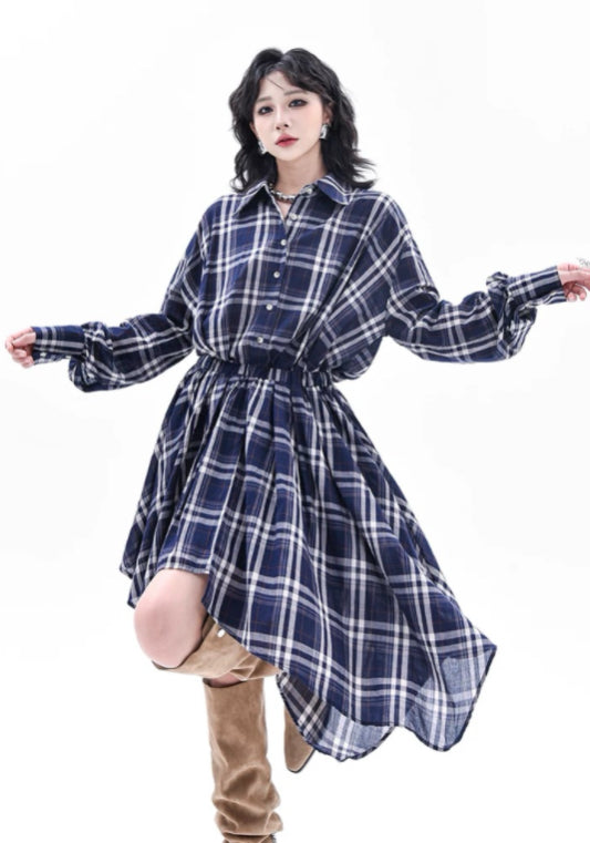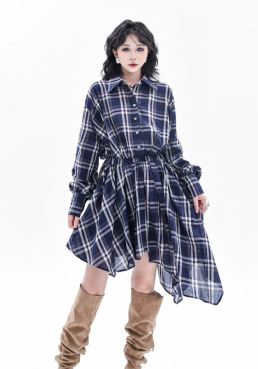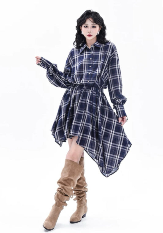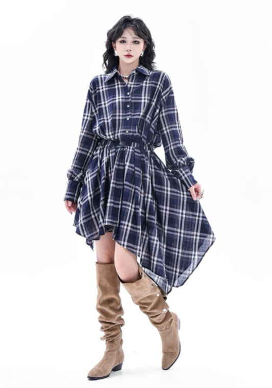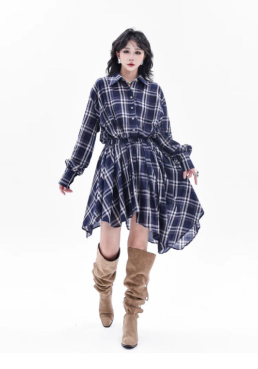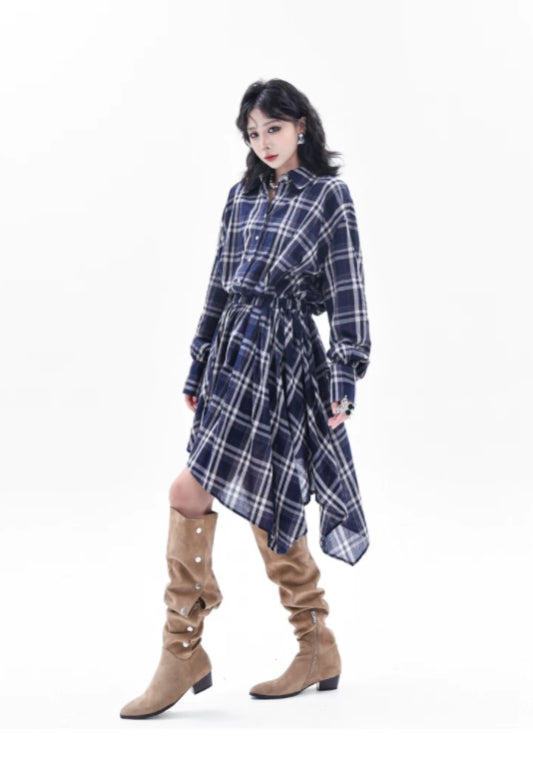 呢款格仔連衣裙設計不規則,下擺飄逸有層次。