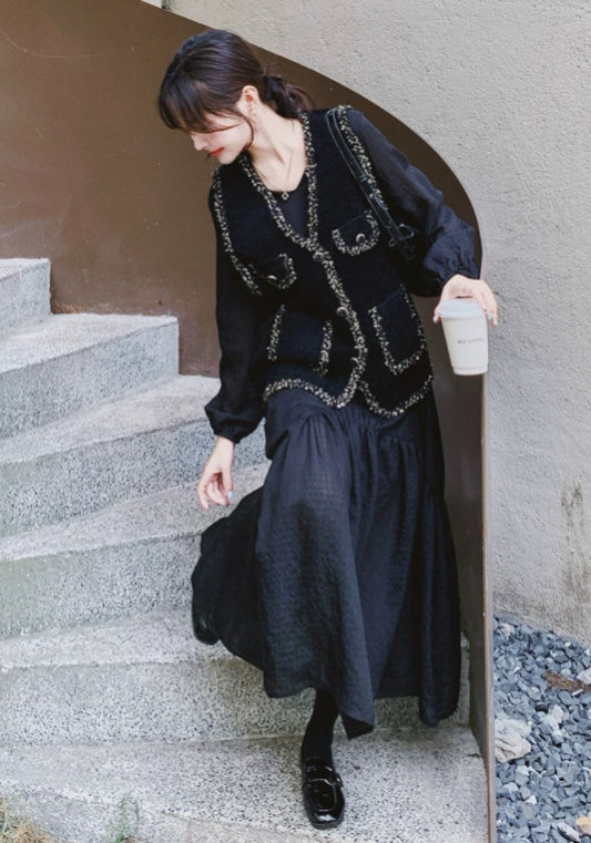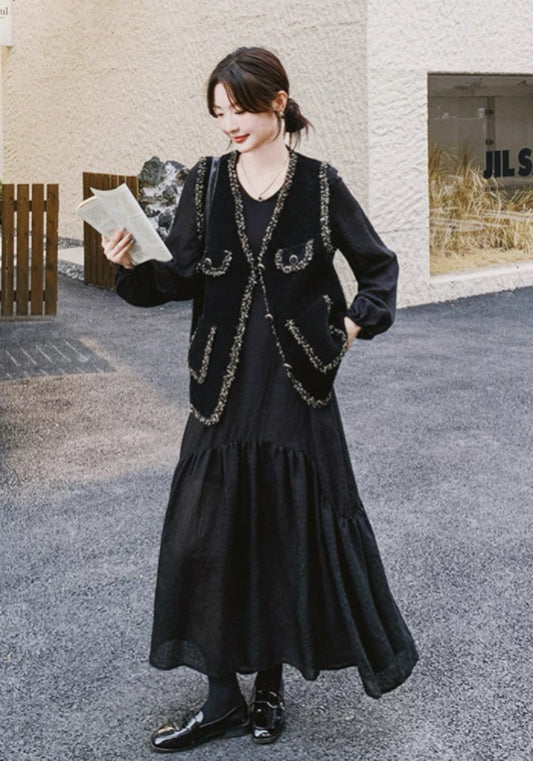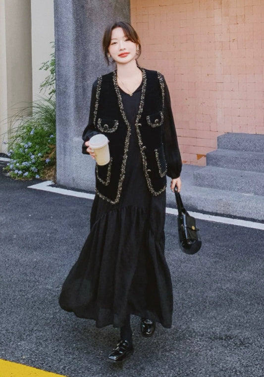 - 黑色主調搭配金色滾邊馬甲,優雅中帶有摩登氣質。