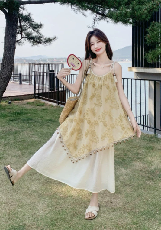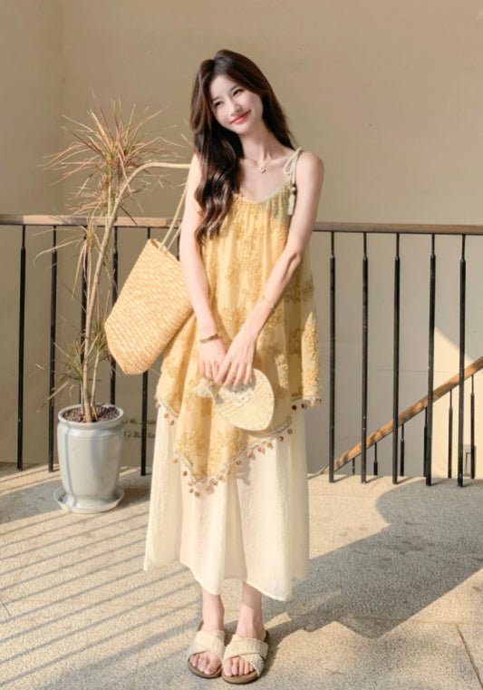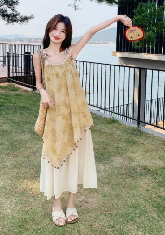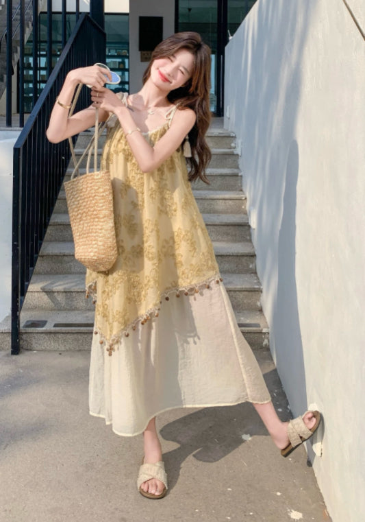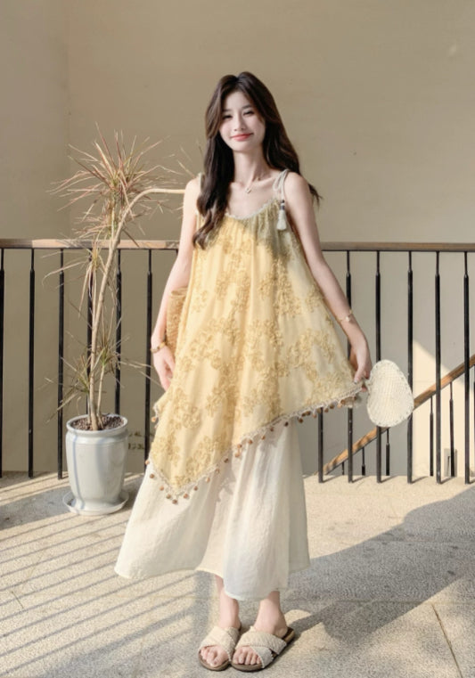 黃色假兩件吊帶裙