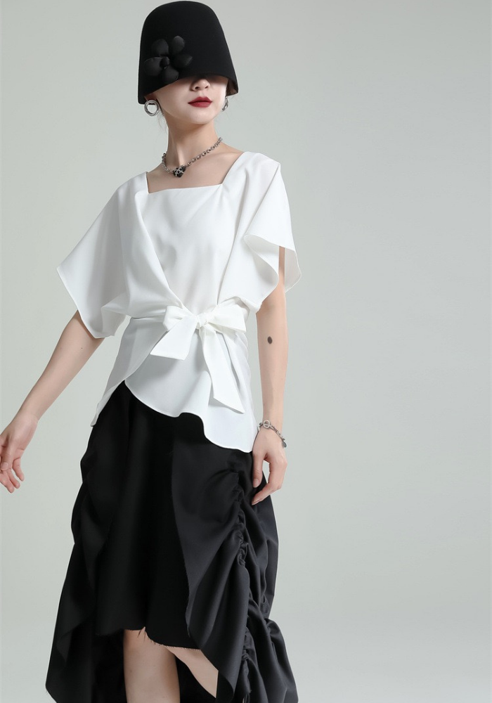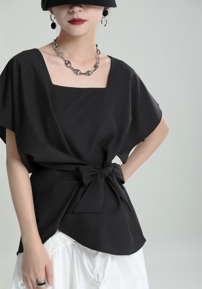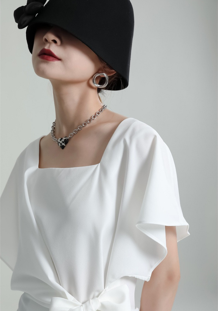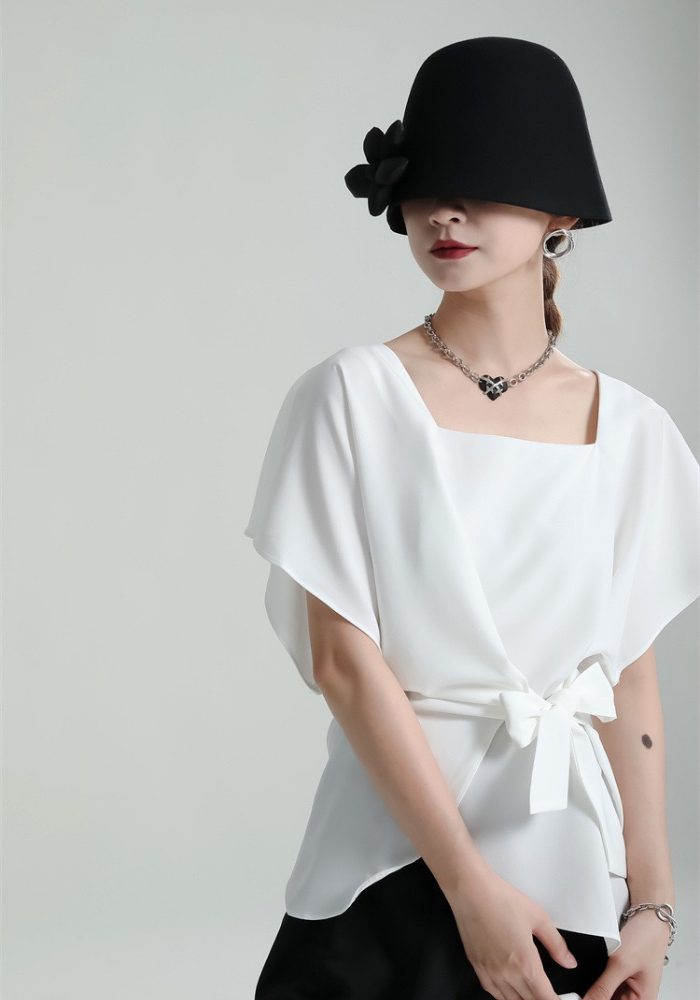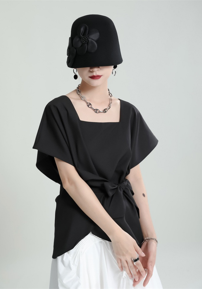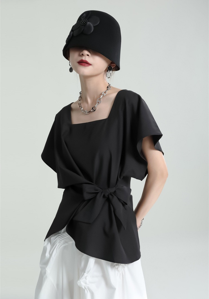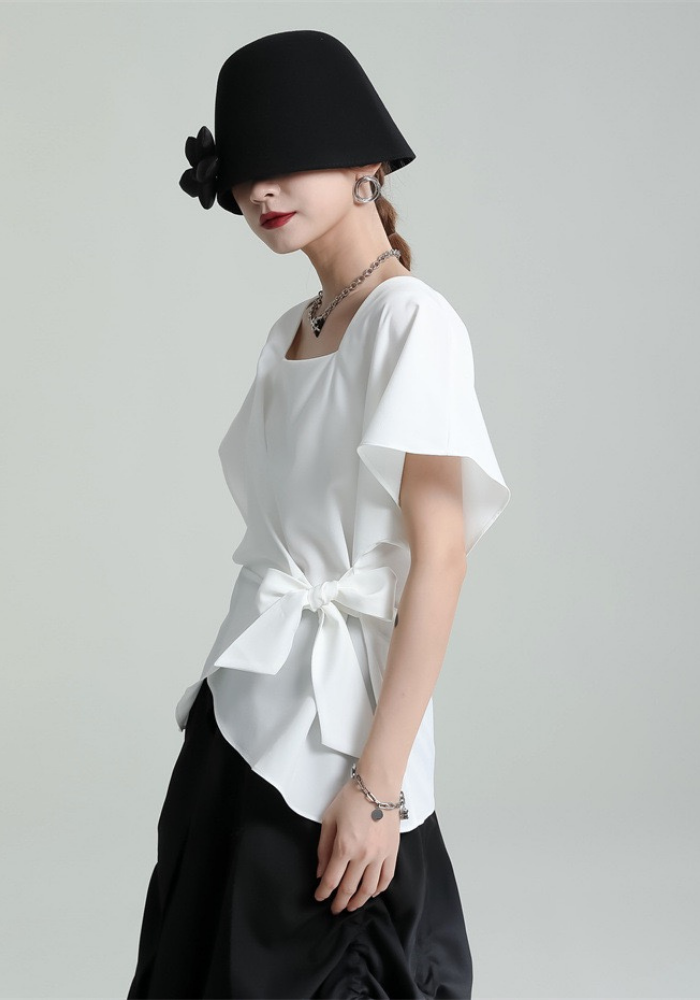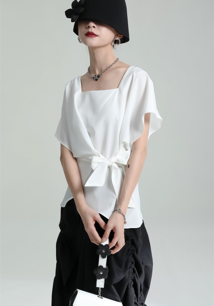 This square-neck ribbon-tied short-sleeved top adopts a simple and elegant design. The square neckline highlights the neck line and adds a bit of sophistication🌈