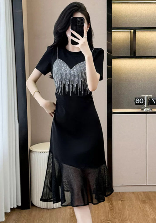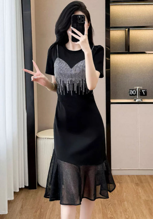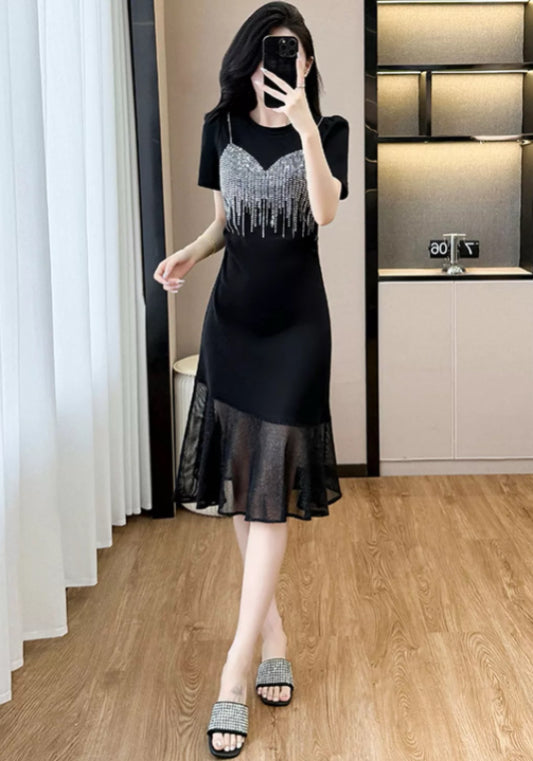 黑色拼接網紗連衣裙,優雅與性感兼具。