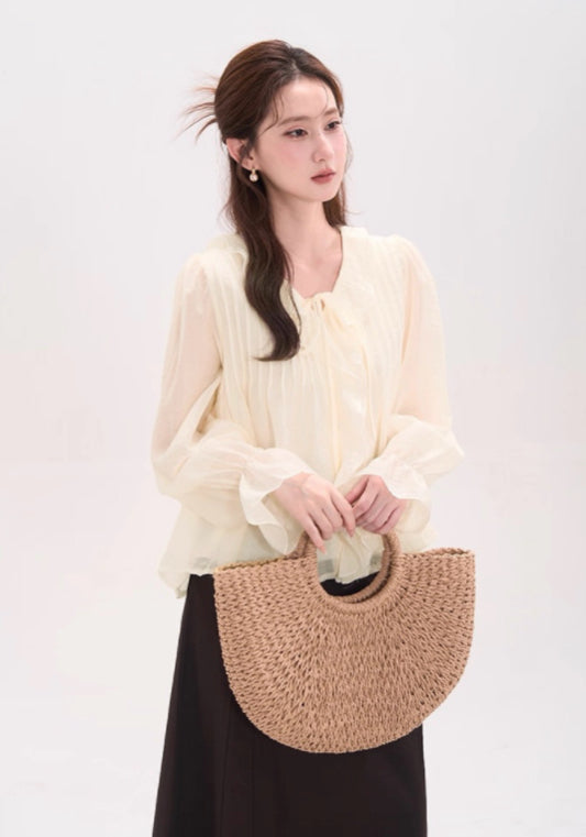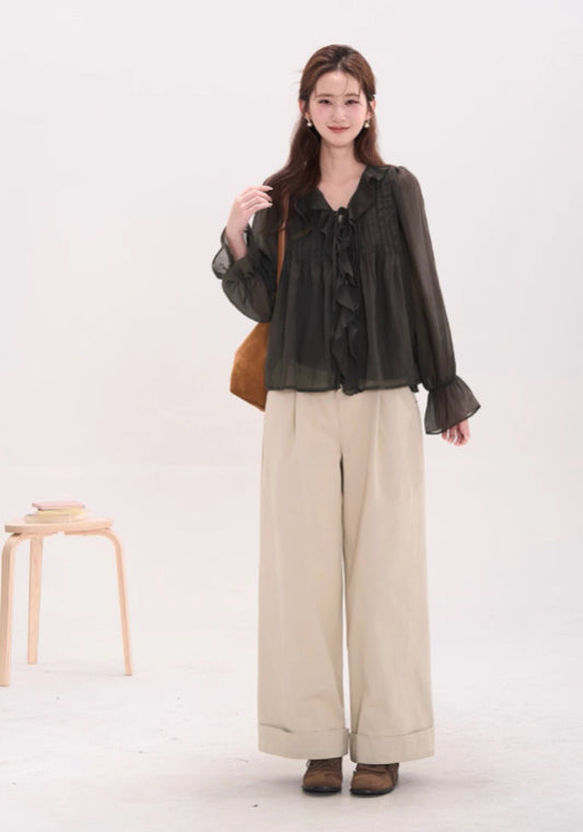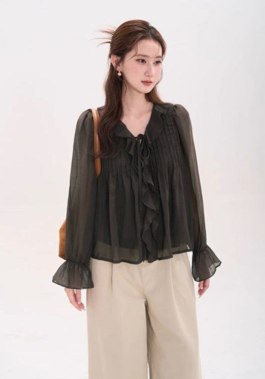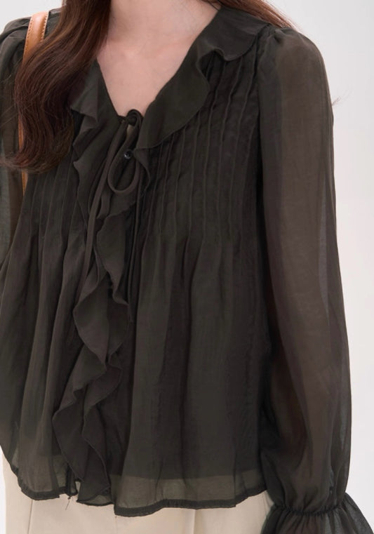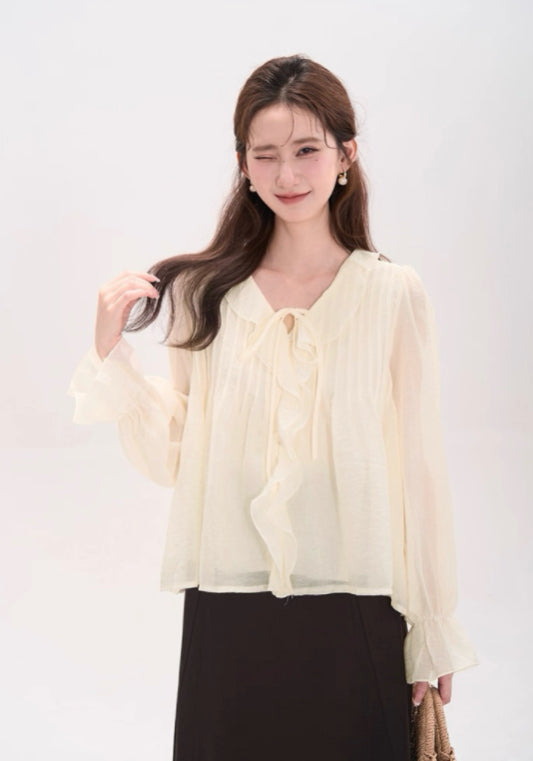 天絲料荷葉邊襯衫,氣質清新淡雅。
