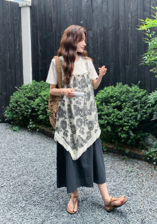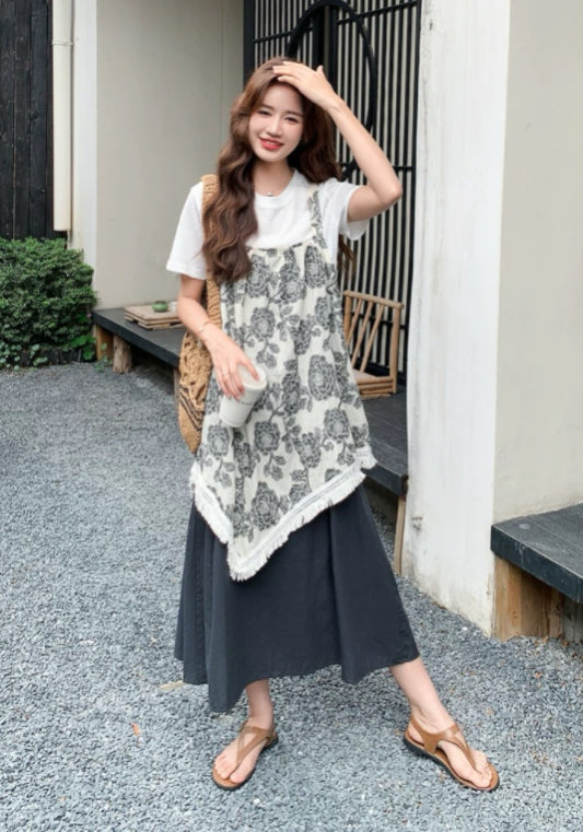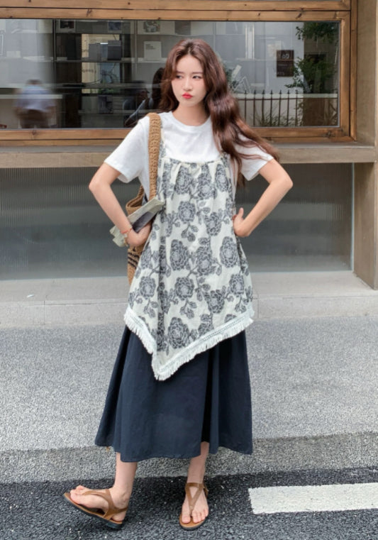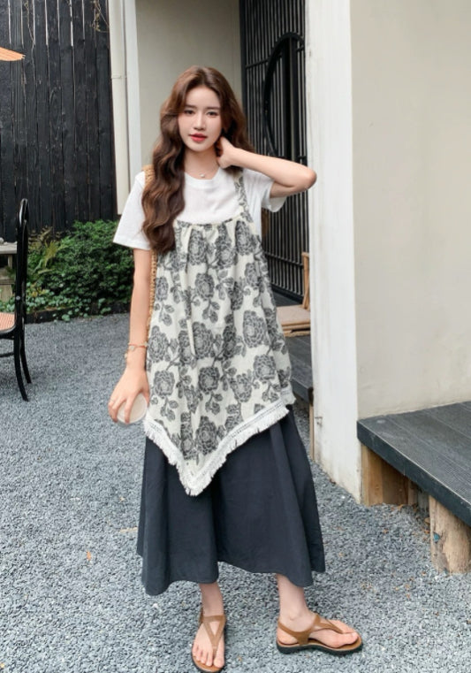 吊帶花紋連身裙搭配純棉內襯上衣,層次感設計簡約時尚。