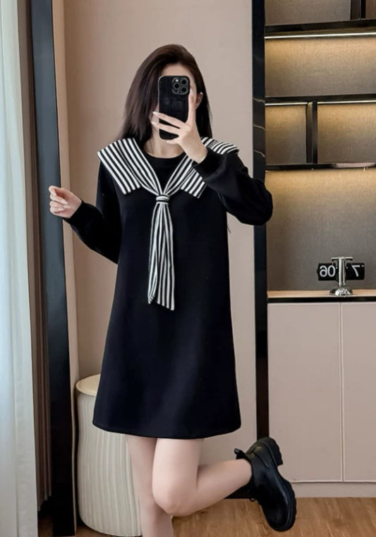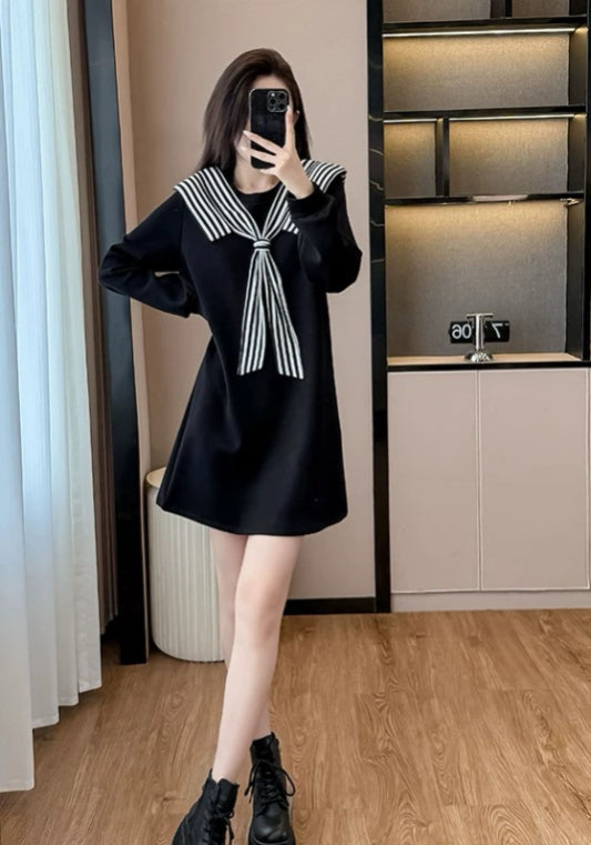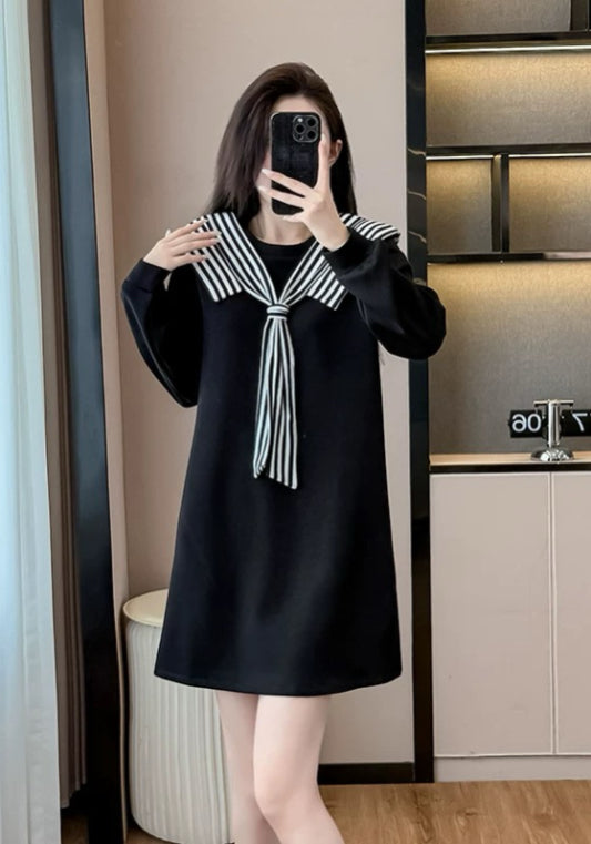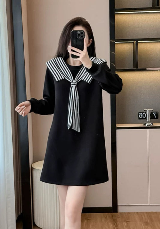 簡約黑色搭配條紋領巾設計,增添優雅氣息。