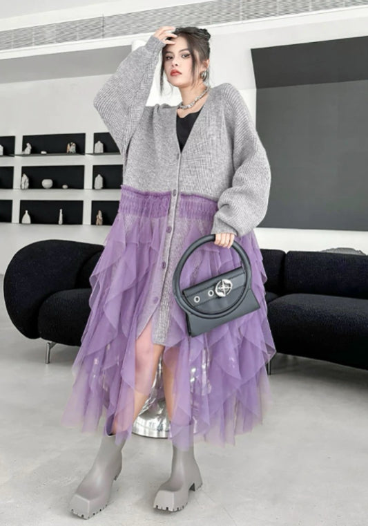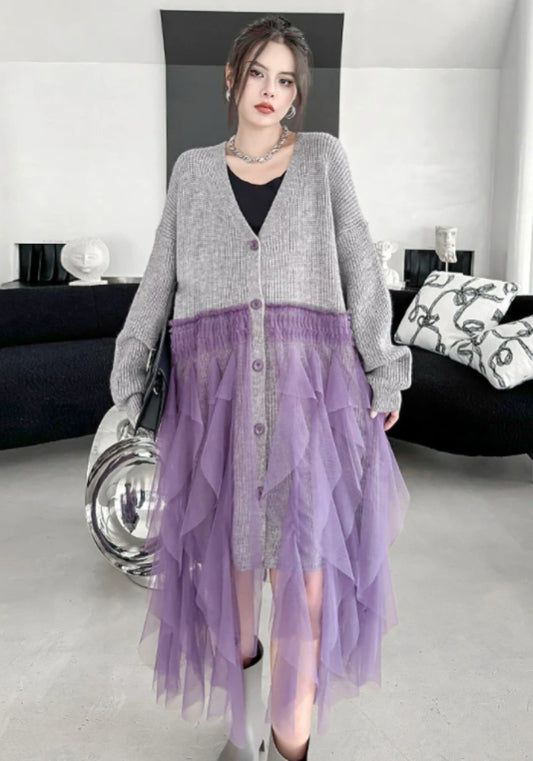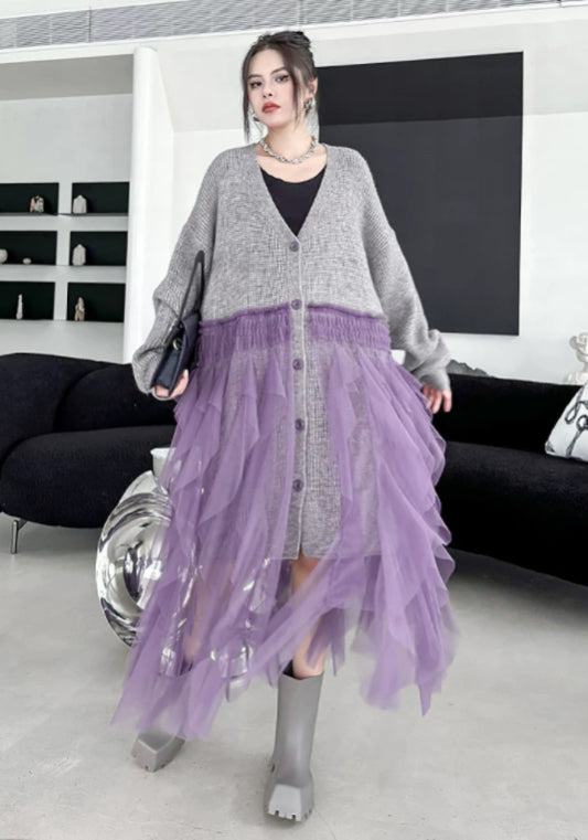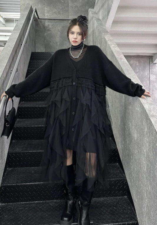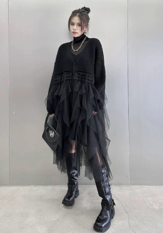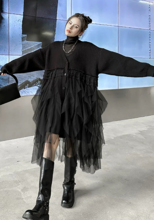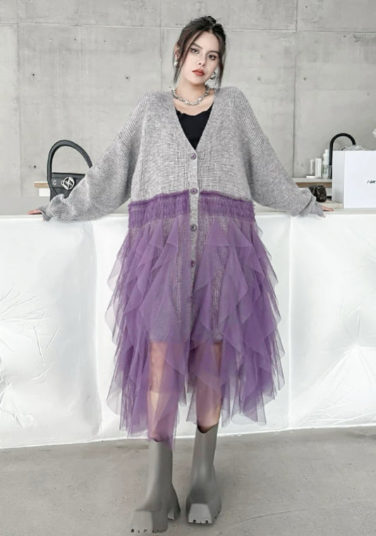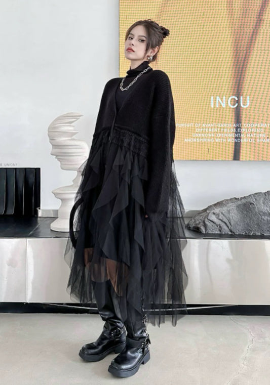 寬鬆針織上衣結合柔紗下擺,遮肉顯瘦。